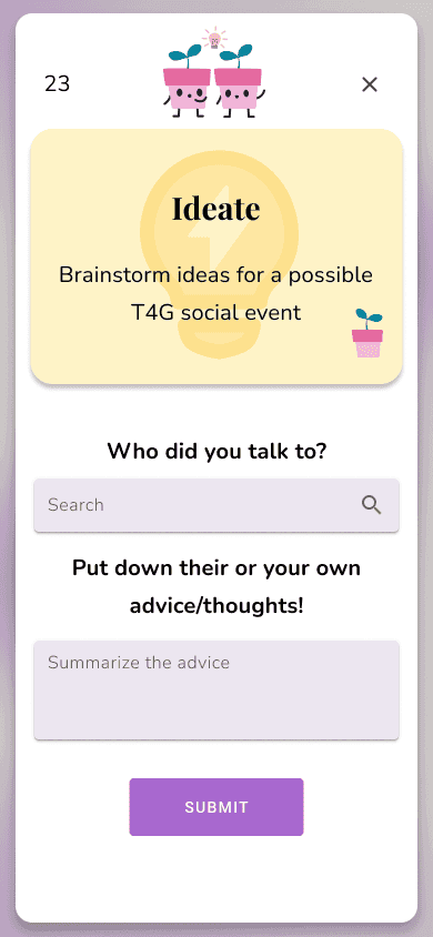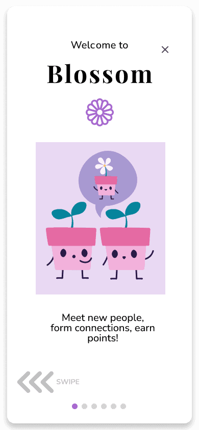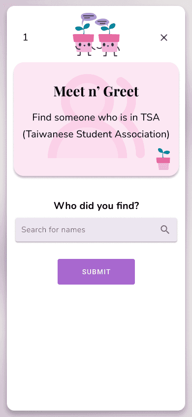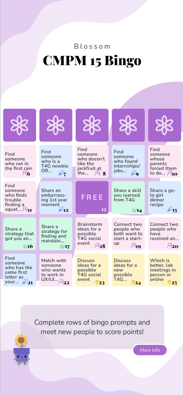 Blossom is an online board game, similar to human bingo, to promote project collaboration and a form to break the ice. Made by Tech4Good @ UCSC, it was proposed to help communities such as class/work/large settings to come together and interact amongst each other based off a series of custom questions that is built from a survey before the game. This survey then generates prompts for users to choose from. This means that the prompts are not random or off-topic from the setting they are in.